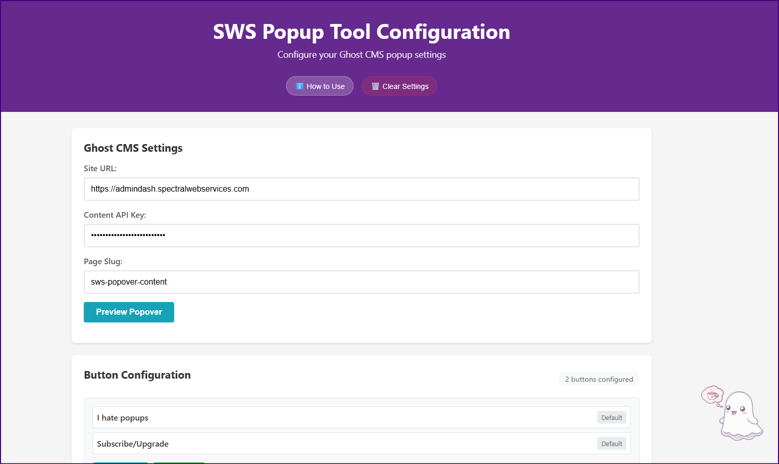 - The buttons are configured in the popup tool. Nothing I did with a Ghost page was going to give this style of buttons, and I wanted to be able to tweak how they behaved for different users.
