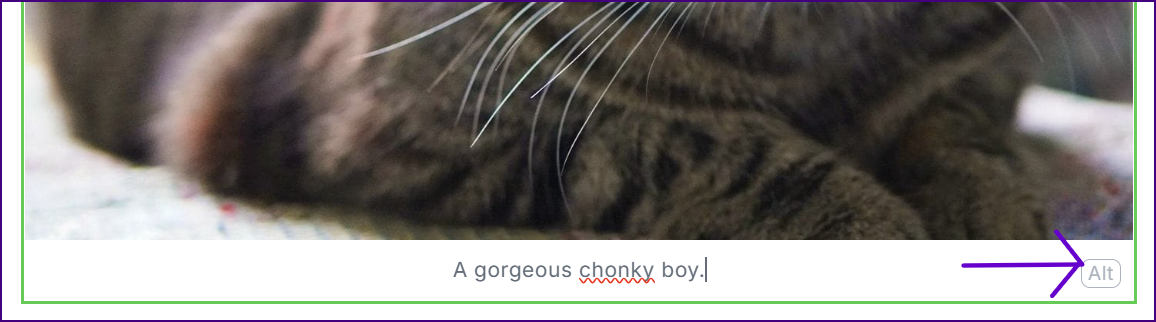 The image card accommodates captions (optional) and alt text (which you should always add unless the image is strictly decorative). To set alt text (used by screen readers) for an image, click the 'alt' button next to the caption.